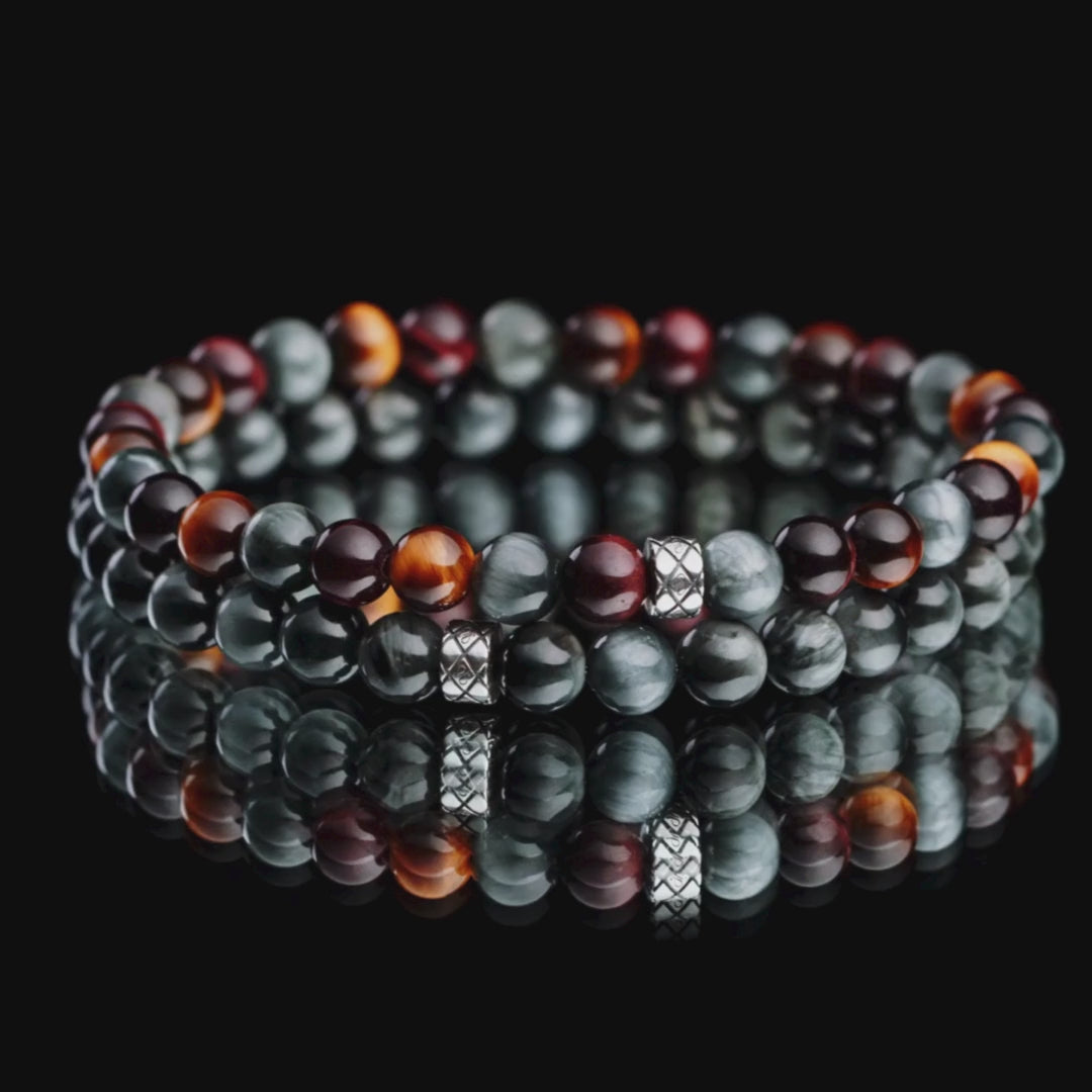 Abacus Eye of the Tiger & Abacus Eagle Eye bracelets with a size of 6 millimetres, combined with 925 Sterling Silver logo beads. Comes with two linen pouches.